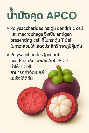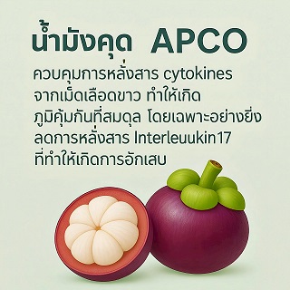 ในงานวิจัยยังพบอีกว่า น้ำมังคุด APCO ควบคุมการหลั่งสาร cytokines จากเม็ดเลือดขาว ทำให้เกิดภูมิคุ้มกันที่สมดุล โดยเฉพาะอย่างยิ่ง ลดการหลั่งสาร Interleukin17 ที่ทำให้เกิดการอักเสบ ค่ะ